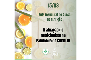 XII Aula Inaugural do Semestre do Curso de Nutrição –A ATUAÇÃO DO NUTRICIONISTA NA PANDEMIA DO COVID-19. O evento vem sendo realizado no primeiro semestre de cada ano letivo. O evento acontecerá na Universidade Regional Integrada do Alto Uruguai e das Missões, Campus de Frederico Westphalen, RS, on-line, no dia 15 de março de 2021, iniciando às 19:15 min. Link do Google Meet: https://meet.google.com/hjk-amra-rew